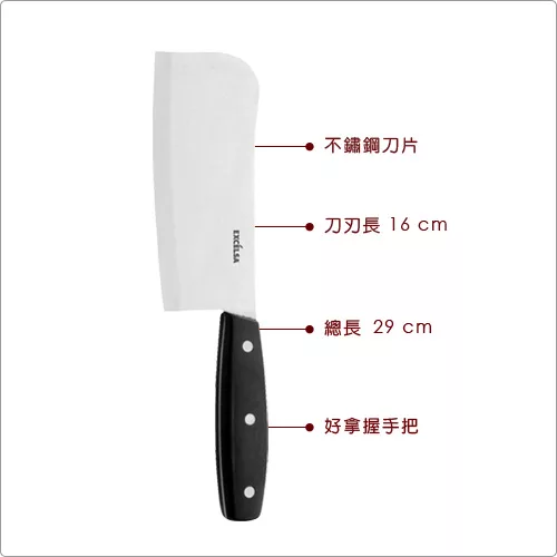 本商品一件入 (刀面長 16 cm)、適用剁切高麗菜或肉品;適用洗碗機並保持乾燥;尖銳物品請遠離孩童、動物。中式家庭廚房中常見的斧狀多功能刀款,為不鏽鋼製刀面,堅硬耐用度佳,搭配長度適中鉚接型握柄,好拿握輕鬆施力;不論是肉類、海鮮、魚類與大量蔬果,想切片或剁碎等,皆可讓您處理食材輕鬆愉快不費力,是效率料理的推薦工具;刀背圓角處理,更安全。