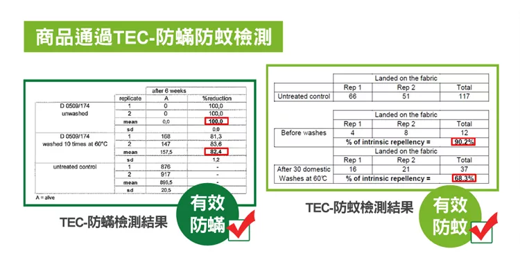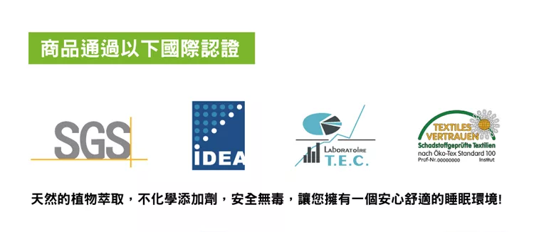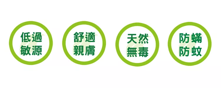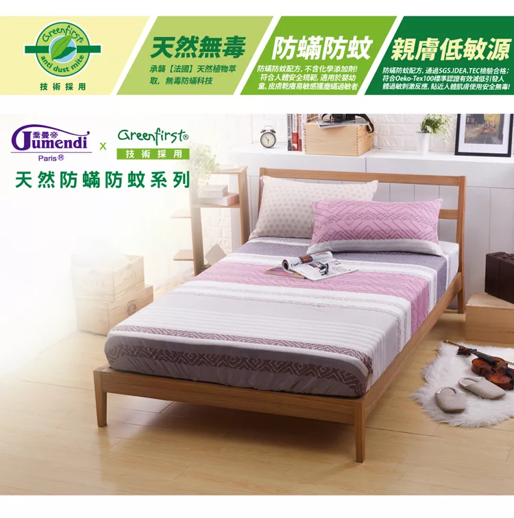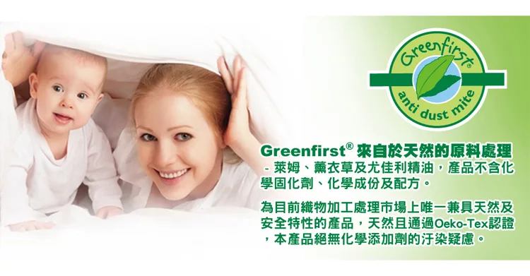 本系列寢具採用法國Greenfirst防蟎防蚊技術,全天然的產品,萃取自檸檬、薰衣草與由加利精油,不化學添加劑,安全無毒,低過敏源,遠離病媒蚊,讓您擁有一個安心舒適的睡眠環境。